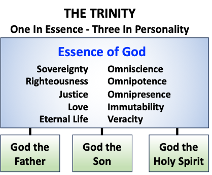 When the Bible speaks of God being one, it is always referring to essence, never to persons. The diagram below illustrates the essence of God with respect to the Trinity whereby each Person of the Godhead is coequal and co-eternal.