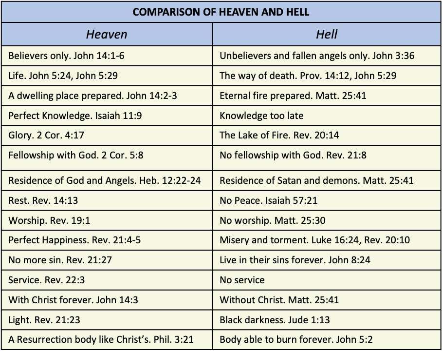 The eternal state will be a very different place for the residence of believers when compared to unbelievers. A comparison of heaven and hell below amplifies these differences.