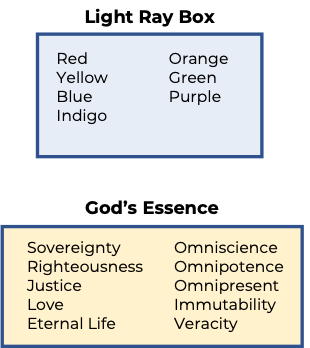 To understand God's characteristics, attributes or essence, that is, what He is like, we can look at the composition of light as an illustration. John 8:12; 1 John 1:5.
