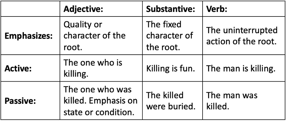 Stem: this indicates two things - first, how the subject is related to the action of the verb or action word, and secondly, the specific nature of the action as to degree; simple, intensive, or causative. Using the verb “to kill,” the following Hebrew stems are standard.