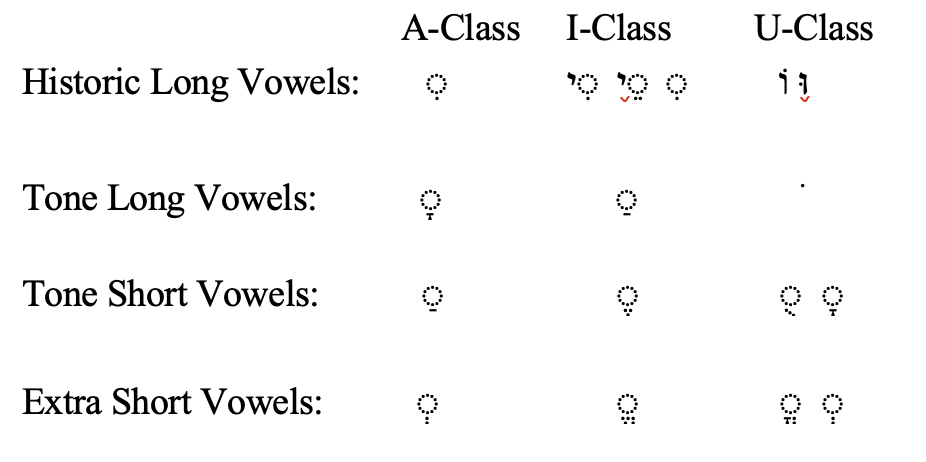 9. Vowels listed as to whether they are Long or Short in tone and by Classification whether A Class, I Class, or U Class.
