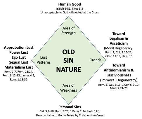 When you look at another believer to find fault, you soon find a crack in their armor. So when you see them with their face in the mud, it makes you feel better because you would never do such a thing! This is a misunderstanding of the makeup of the old sin nature. The old sin nature has trends, some ascetic or law-keeping and some lascivious or lawlessness. One believer out of fellowship may be a law-keeper. Another out of fellowship may be a lawless one. But both are out of fellowship. Neither pleases God. See the old sin nature diagram below.