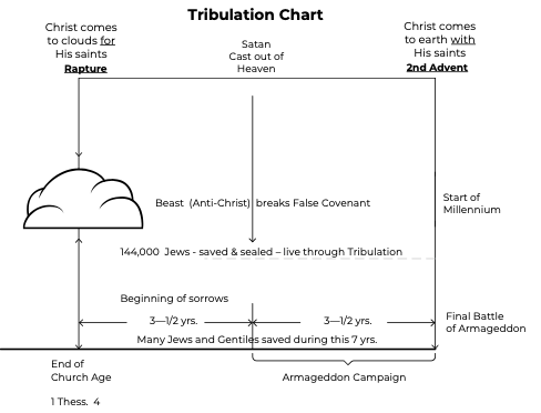 None of the New Testament passages on the Tribulation mention the Church. The Rapture of the Church is never mentioned in any passage dealing with the Second Advent of Christ after the Tribulation. Matt. 24; 1 Thess. 1:9-10; 1 Thess. 5:4-9; Rev. 4 - 19.